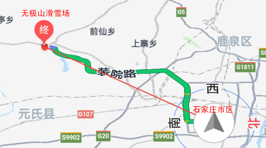 无极山滑雪场距石家庄市43公里,车程1小时左右。